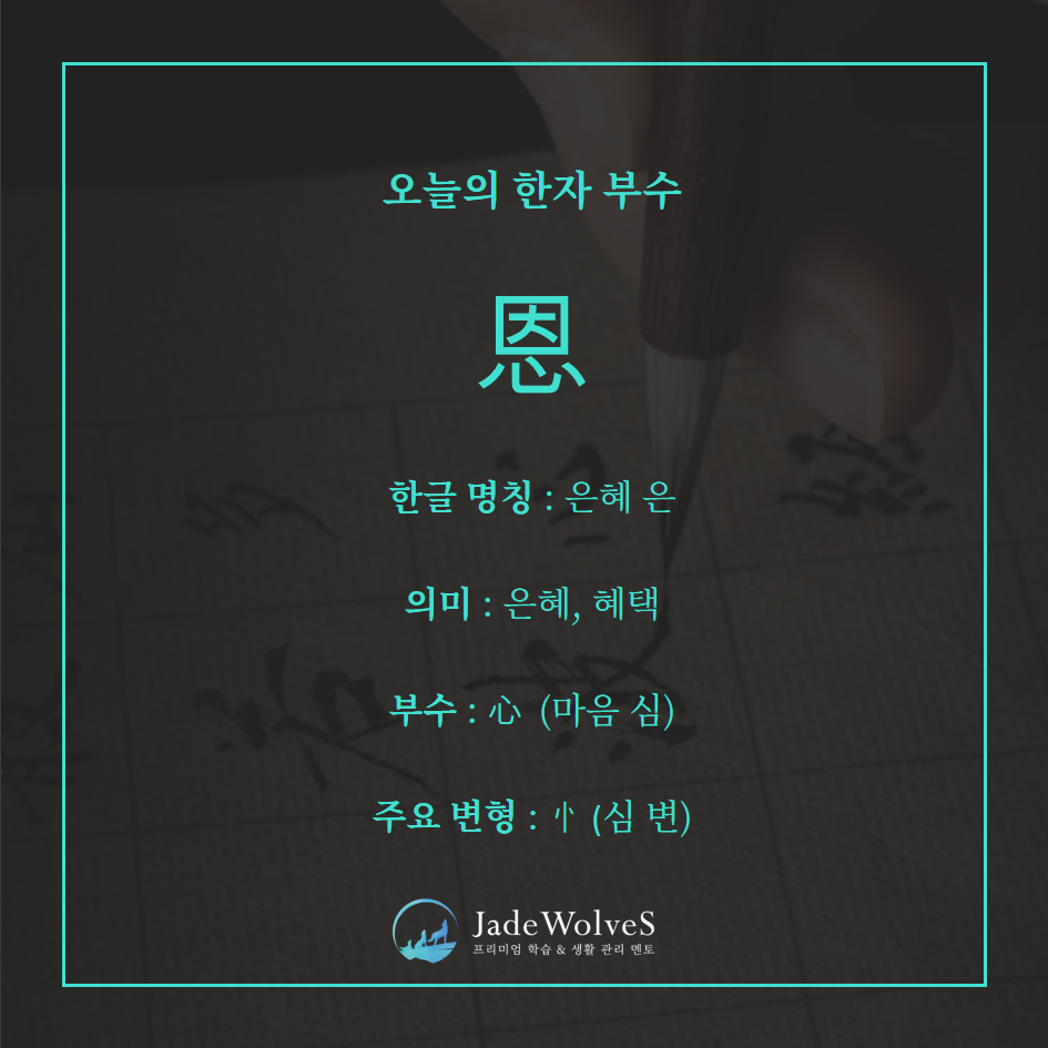 ‘恩’은 心(마음 심)을 뜻으로, 因(인할 인)을 음으로 한 형성자입니다.