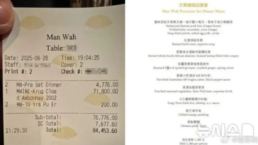 홍콩의 한 고급 레스토랑에서 텔레그램으로 만난 남성과 식사하던 31세 여성이 남성이 “화장실에 다녀오겠다”고 한 뒤 사라지자 8만HKD(약 1430만 원)를 대신 결제한 사건이 발생했다. 남성은 자신을 변호사로 소개했고, 여성은 친구 도움으로 결제 후 경찰에 사기 혐의로 신고했다. 영수증에는 1인 2,388HKD짜리 최고급 코스와 함께 크루그 ‘Clos’ 샴페인(한 병 약 7만1,800HKD)이 포함돼 고액 청구의 상당 부분이 주류에서 발생했다. 현지 경찰은 수사 중이나 아직 체포자는 없는 것으로 알려졌다.