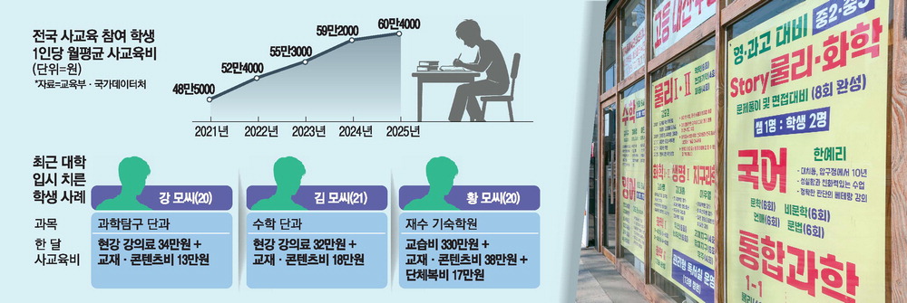 대학 입시 사교육비에서 수강료만큼이나 교재비·콘텐츠비가 큰 부담으로 떠오르며 '배보다 배꼽이 더 큰' 비용 구조가 확산하고 있다. 서울 강남 대치동 학원가에서는 필수·선택 교재와 강사 제작 자료가 다층적으로 판매되고, 주간지·사설 모의고사 등이 '콘텐츠비' 명목으로 사실상 수업 필수 구매 항목이 되는 사례가 적지 않다는 지적이 나온다. 학부모들은 과거보다 '학원 콘텐츠'로 판매되는 교재량이 늘어 매달 추가 비용이 커졌다고 토로했고, 수험생들은 강사의 커리큘럼을 따르기 위해 울며 겨자 먹기로 구매할 수밖에 없었다고 말한다. 한 재수 기숙학원은 월 교습비(수업료+숙식비) 360만원을 안내하면서도 단체복비·교재비·콘텐츠비는 별도라고 밝혔고, 상담 과정에서는 교재·콘텐츠비가 평균 50만원, 수능 직전에는 80만~90만원까지 늘 수 있다고 설명한 것으로 전해졌다. 결과적으로 월 실지출이 430만원 수준으로 뛰는 구조가 형성된 셈이다. 하지만 비싼 값을 주고 산 교재를 제대로 활용하지 못해 미사용 주간지·모의고사가 대량으로 남거나 중고 거래로 처분하는 사례도 이어진다.